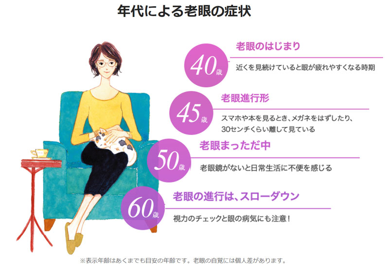 年齢ともにお近くが見えにくくなることは知られていますが、年齢に関係なく目の調節力は徐々に低下していきます。