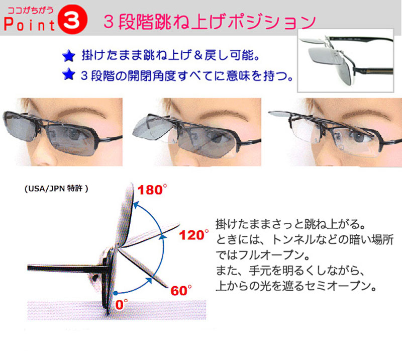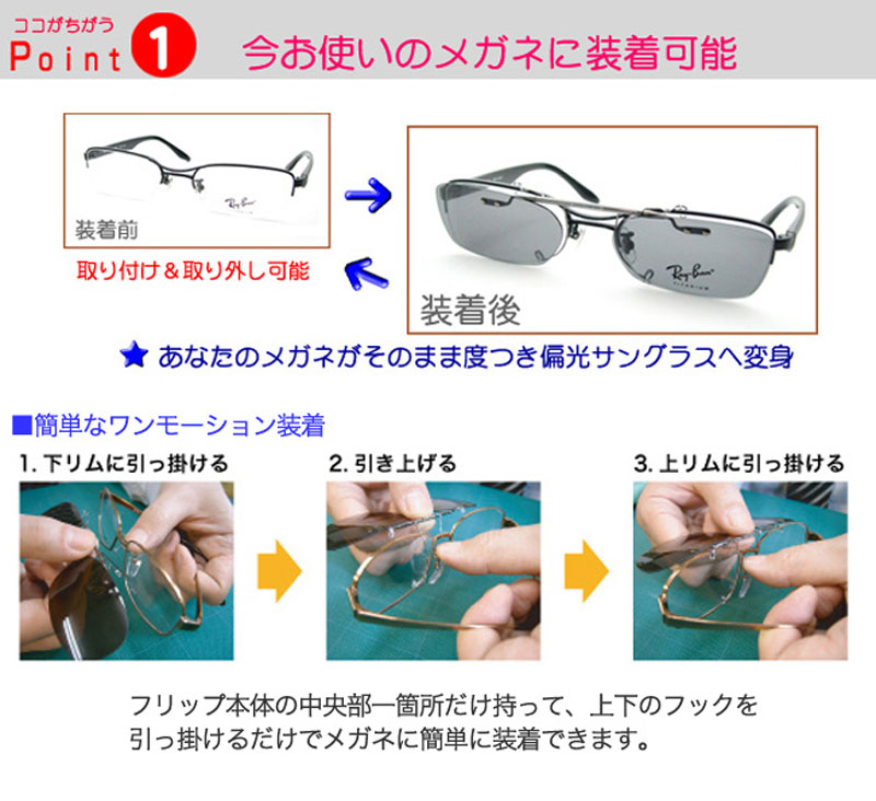 お手持ちのメガネの形状に合わせて、オーダーメイドでお作りする前掛けタイプのクリップオン偏光サングラスです。(CAESER-FLIP2)