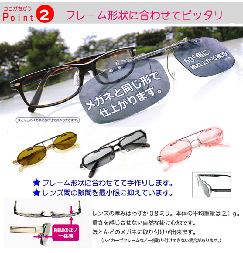 今お使いのメガネにピッタリと合う前掛タイプのサングラスのご紹介です。