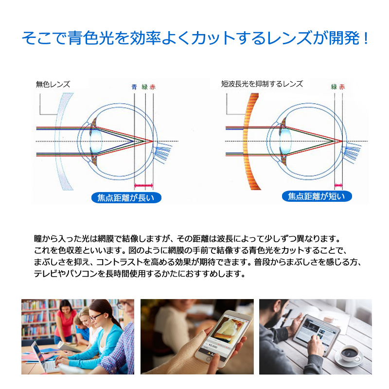 眼のちらつきや疲れやすさを少しでも軽減したい方は【ブルーライトカット】のレンズがおすすめです。