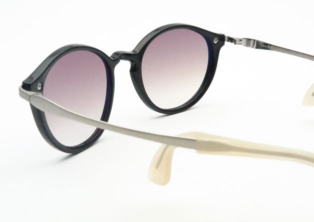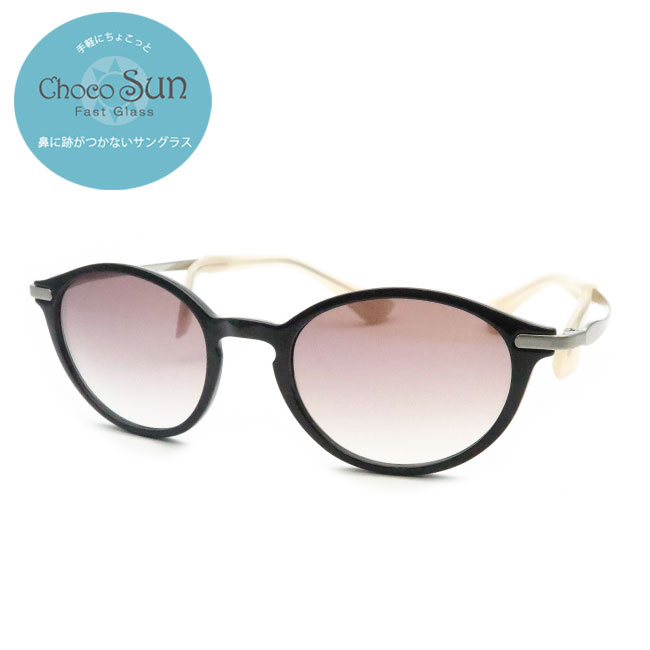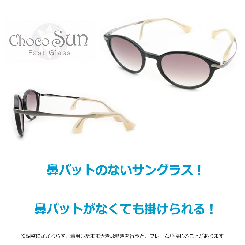 ちょこサンは鼻パットがなく、側頭部を前モダンと後モダンで挟み込み、鼻の上で浮くように掛けられるサングラスです。