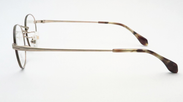 シンプルなフォルムにツートンのカラーリングでトレンド感を演出したデザイン。こちらもチタン使用で軽いフレームです。テンプルのゴールドがつや消しのマットゴールドなので抑えめで馴染みやすくおすすめです。