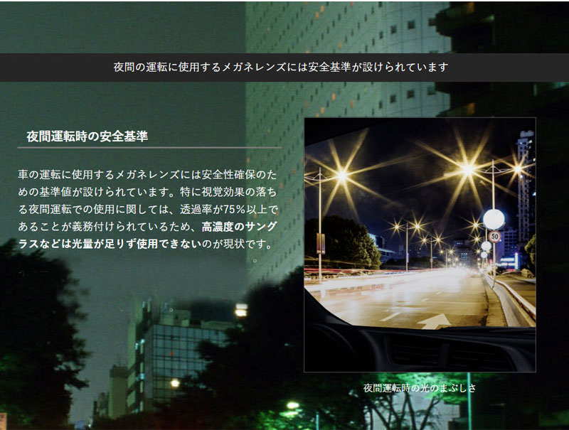 これは安全運転のためには一定の濃度以上レンズが装着されたサングラスを使用することが、夜間では視力低下や視界を狭くするために危険であるからです。