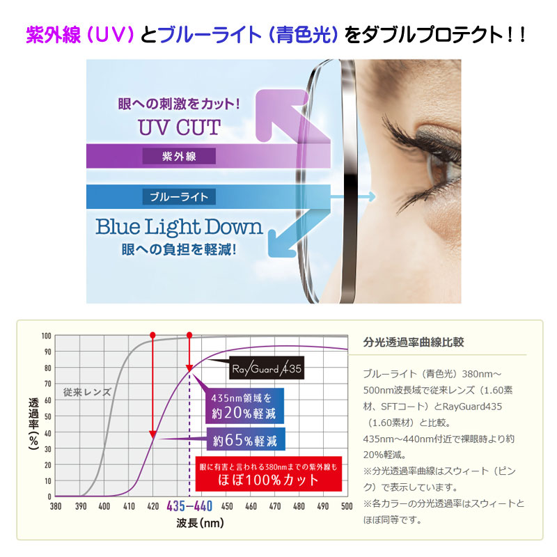 紫外線領域+ブルーライト領域をカットすることで体感的な眩しさを軽減します。