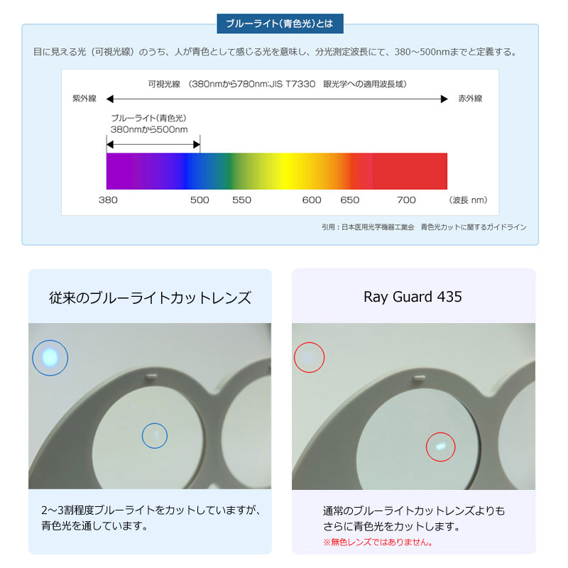 【右側】レイガード435レンズ・・青色光線はレンズ面で反射し、ほとんど透過していません。