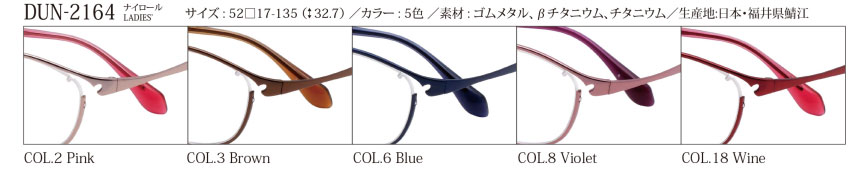 この DUN-2164 ゴムメタルでおなじみの三光光学のDUNからの発売。ゴムのような特徴を持つ素材の「GUMMETAL」ならではのしなやかさ、ホールド感は一度かけてみるとよさが分かります。国産メガネの技術を集めたフレームと言えます。