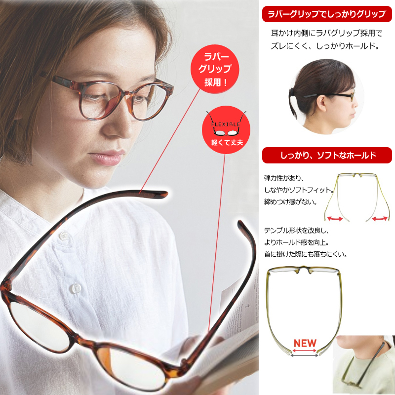 以前にもあった商品ですが、今回は首にかかる部分がラバータイプに改良されていて以前よりも、首にメガネを掛けた時に、引っかかりやすくなりました。