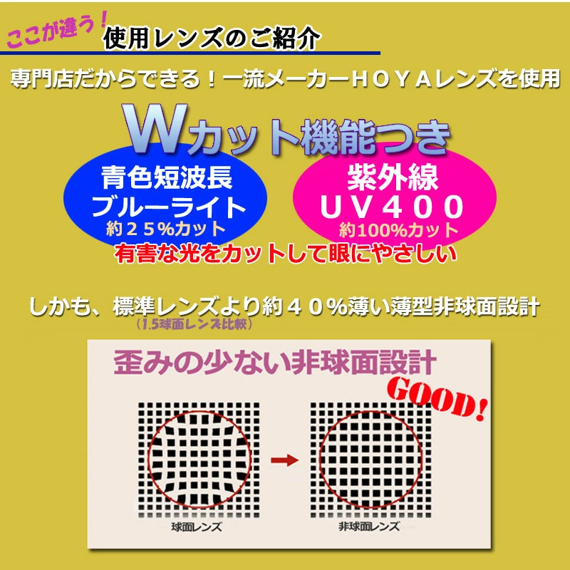当店ではこちらのメガネには【薄型非球面レンズ】 + 【UVカット】 + 【ブルーライトカットコート】つきレンズをお付けします。