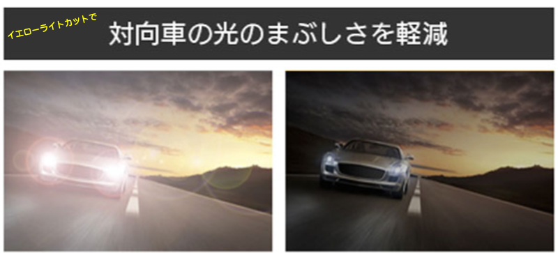 眩しいと感じやすい黄色光(イエローライト)を効果的にカット。580nm 領域を約64%カットする事により、眩しさやちらつきの軽減とコントラストを高める効果。夜間運転も可能