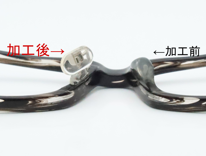 鼻パット式に加工する事により、鼻幅や形状に合わせて鼻の部分を調整をすることが可能になりますので、下がりにくく快適に掛けられるようになります。