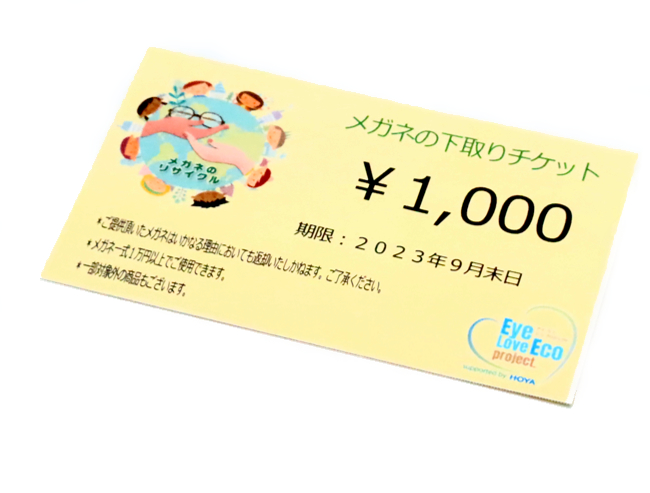 プロジェクト実施期間内に店頭にて不要なメガネを回収させていただくと、下取りキャンペーンとして当店で使える1000円分のクーポンをお渡しさせていただきます。