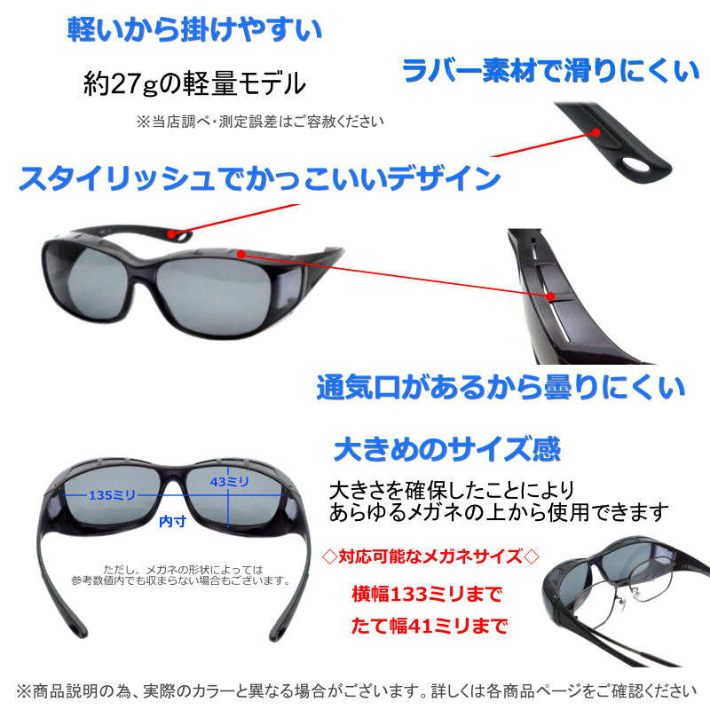 メガネを常用で掛けている人の悩みとして「まぶしい時に気軽にサングラスが掛けられない」という事があると思いますが、今回は常用しているメガネの上からでも掛けられるオーバーグラスタイプの偏光機能付きサングラス(OVER GLASS)のご紹介です。