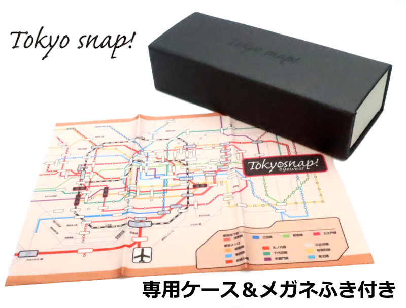 四角形の専用ケースと東京の路線図がプリントされたおしゃれなメガネふきが付属しています。