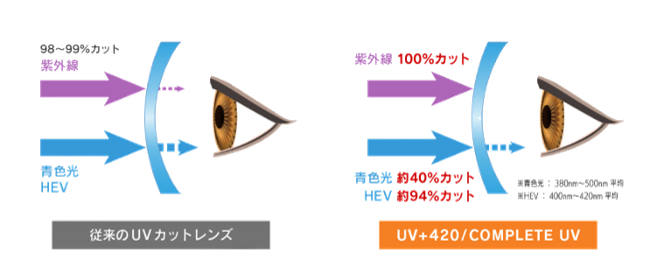 COMPLETE UV機能は目に有害な紫外線カット〔100%〕はもちろんのことHEV 高エネルギー可視光線域〔380nm~ 420nm〕をカットすることにより、水晶体や網膜へのダメージを軽減します。