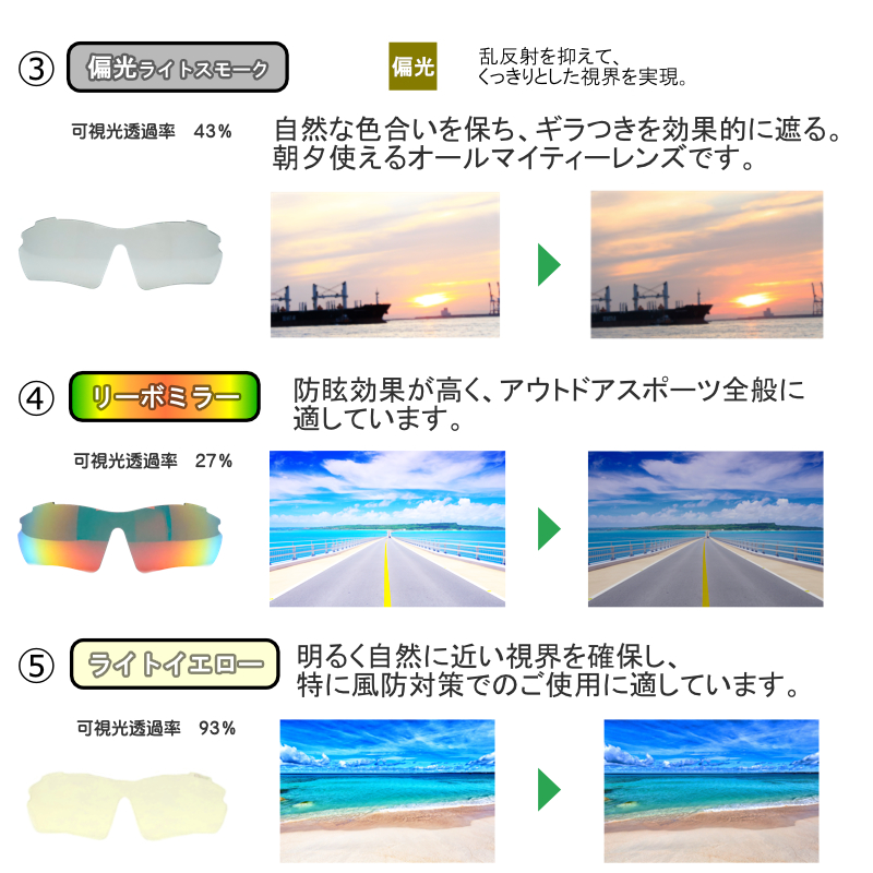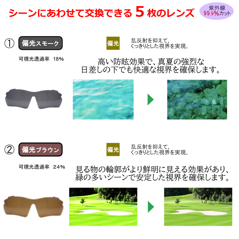 このサングラスには、インナーフレーム&度入りレンズが付属しており、視力補正が必要な方でもクリアな視界を確保できます。さらに、偏光スモーク、偏光ブラウン、偏光ライトスモーク、リーボミラー、ライトイエローの5種類の交換レンズがセットになっており、天候や環境に応じて最適なレンズを選べます。