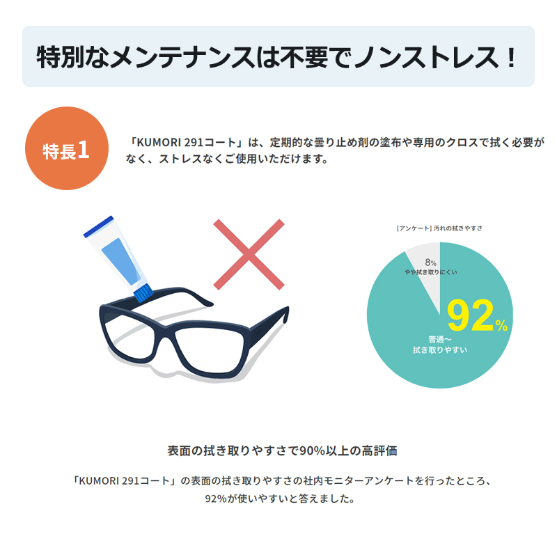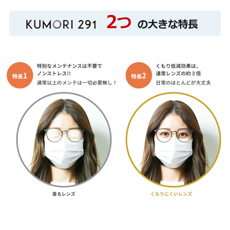 HOYAの「KUMORI291」レンズは、特別なメンテナンスが不要で、くもりにくい特性を持つ眼鏡レンです。マスク着用時でも視界がくもりにくく、日常生活での視界をクリアに保ちます。