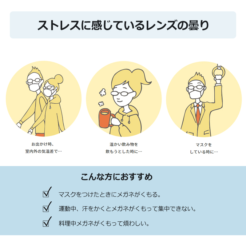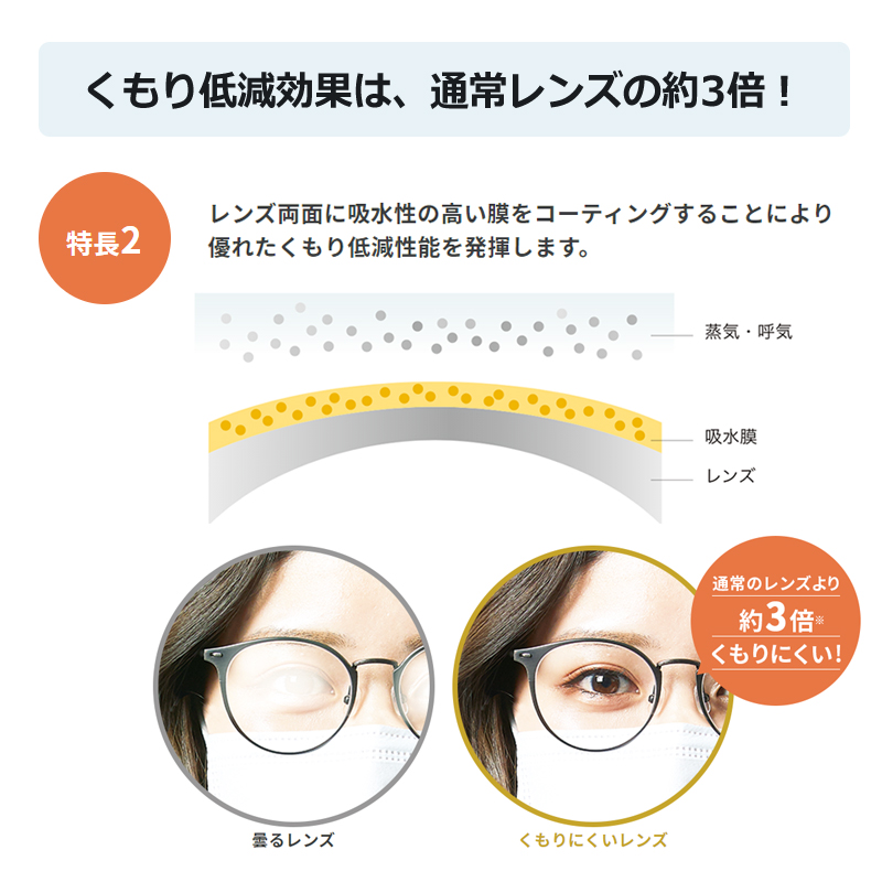 メガネが曇りやすい環境でも視界の鮮明さを求める方におすすめのレンズです。