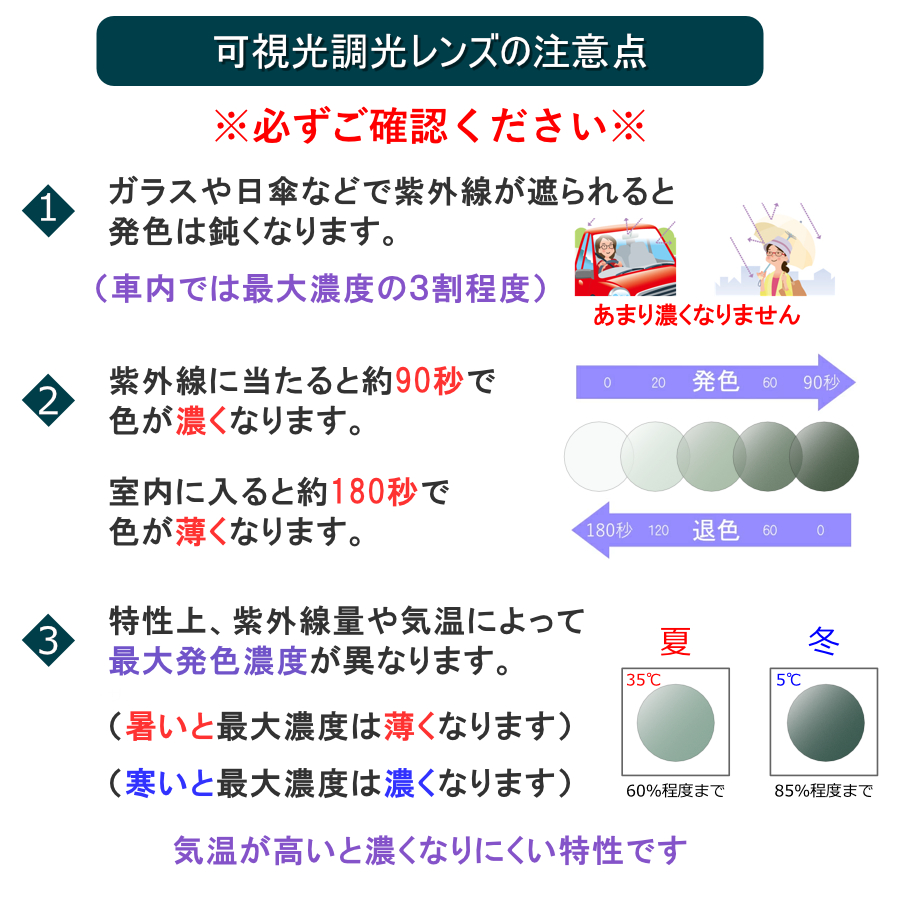 紫外線+可視光に反応して発色する可視光調光レンズも普及し始めています。