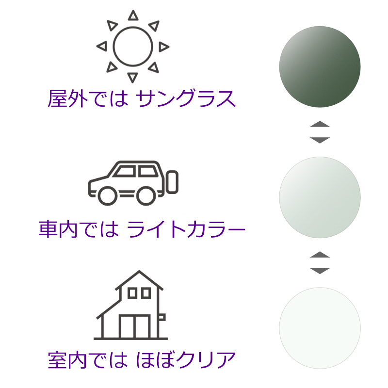 屋外はサングラス、車内はライトカラーレンズ、室内はメガネとして使用したい方には最適なレンズです。
