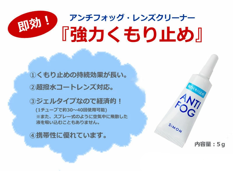 ◆強力くもり止め(ジェル)・・・1本660円。ジェルタイプの為、レンズの表面に長く留まって効果が持続します。