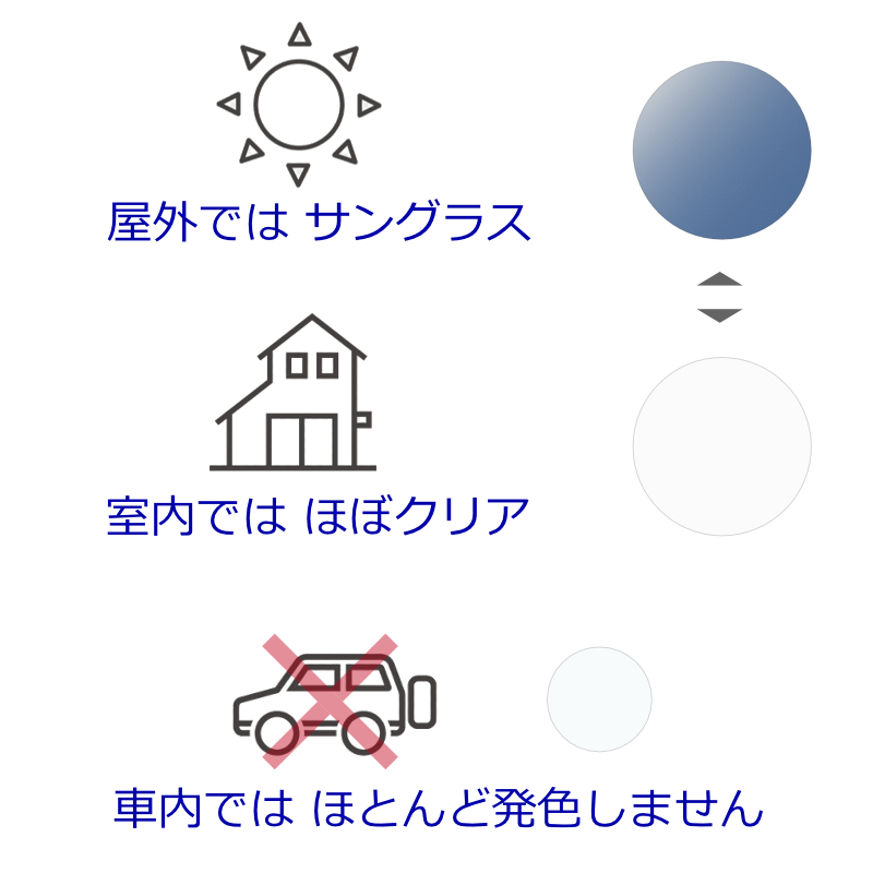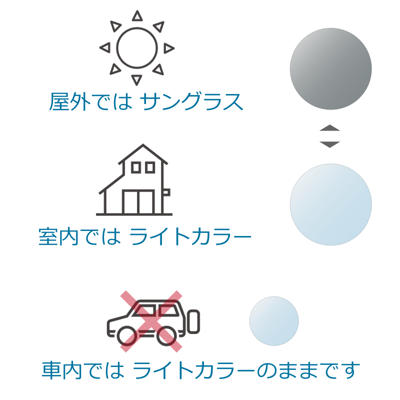 室内や夜間はライトカラーレンズとして・屋外で紫外線に当たると一般的な調光レンズと同じように発色します。