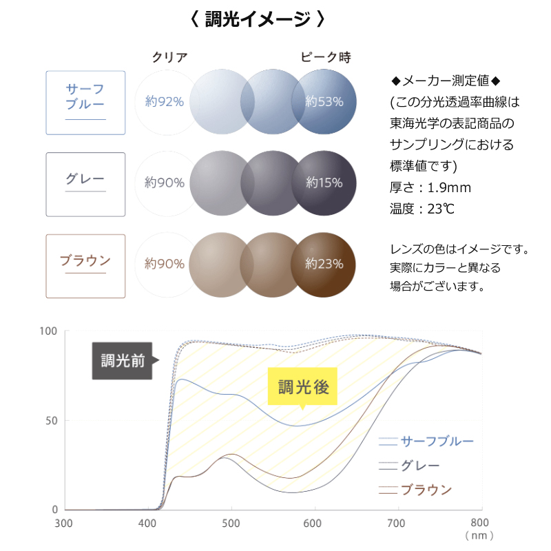 ※メーカーによって可視光調光がベースになっているタイプや、UV420(紫外線、ブルーライト、高エネルギー可視光線をカット)タイプなどもあります。