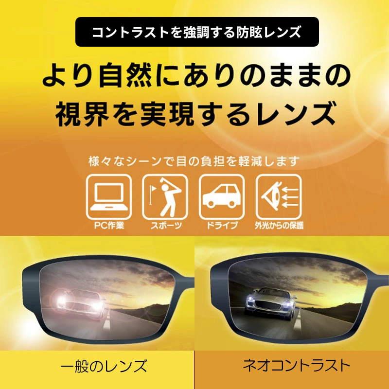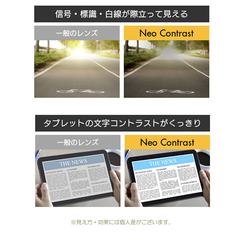 夜間はネオコントラストレンズとして、日中の日差しの下ではサングラスとして使用できます。