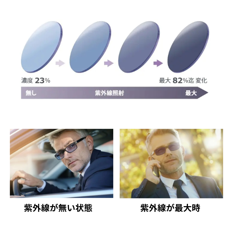 一般的な調光レンズと同じく、室内ではクリア・屋外では紫外線に反応して発色するレンズです。