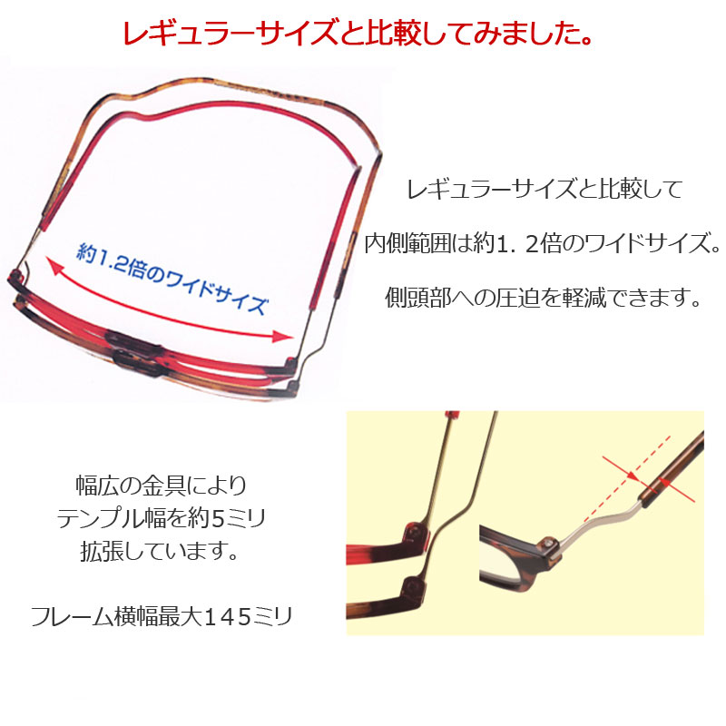 - ワイドサイズ:側頭部の圧迫を軽減するため、フレームの横幅や奥行きが広めに設計されています。ヒンジ部分やヘッドバンドが可動式で、左右にスライドして調整可能