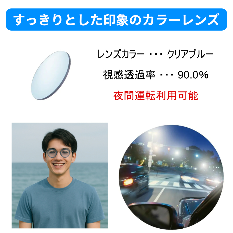 - レンズカラー:クリアブルー(濃度10%~15%程度の見た目)