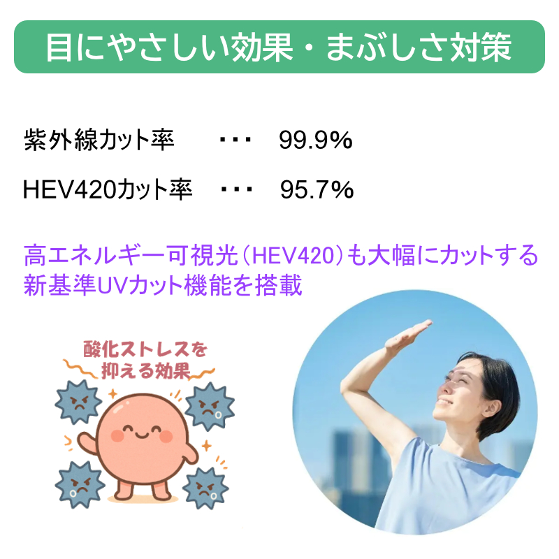 - HEV420カット:95.7%(高エネルギー可視光を大幅にカット)