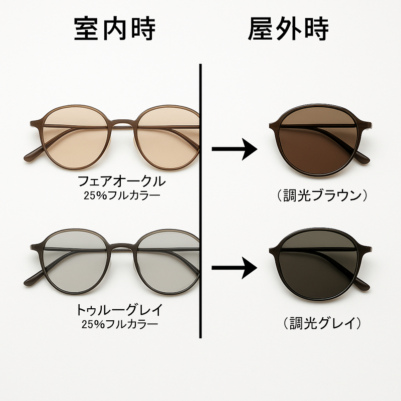 通常の調光レンズは「室内では無色、屋外で色がつく」タイプですが、