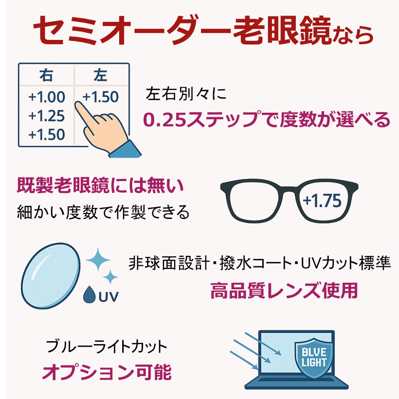✅ セミオーダー老眼鏡で選べるポイント