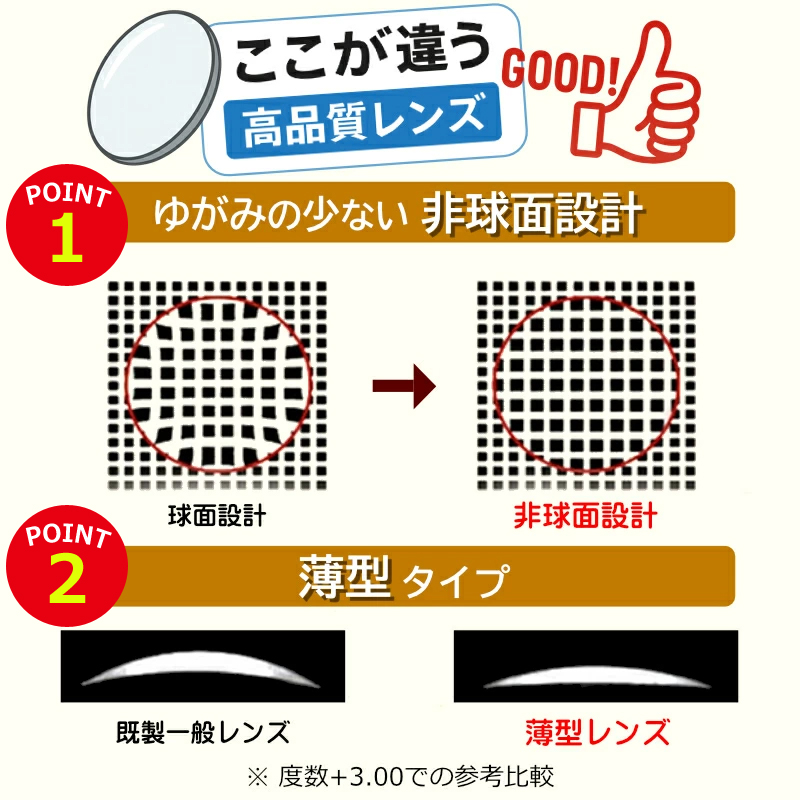 | レンズ設計 | 球面(一般的) | 非球面薄型 |
