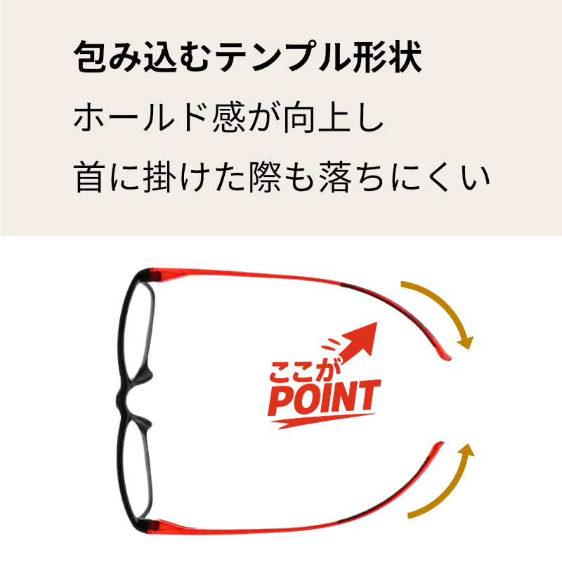 CACALUの最大の特徴は、テンプル(つる)が長めで首に掛けやすい構造になっていること。