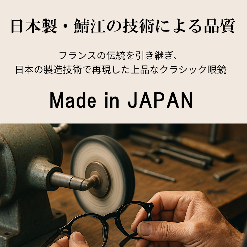 日本のメガネ産地として有名な 福井・鯖江を中心とした熟練工場で生産される “純日本製” のフレームで、仕上がりの美しさと掛け心地の良さが特徴です。