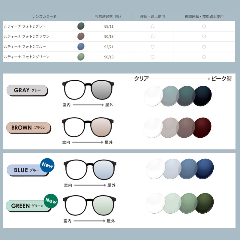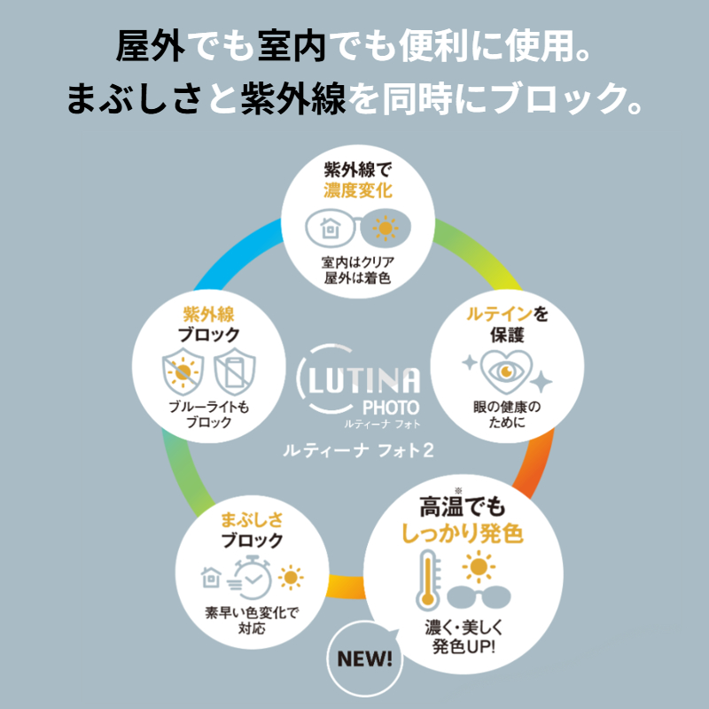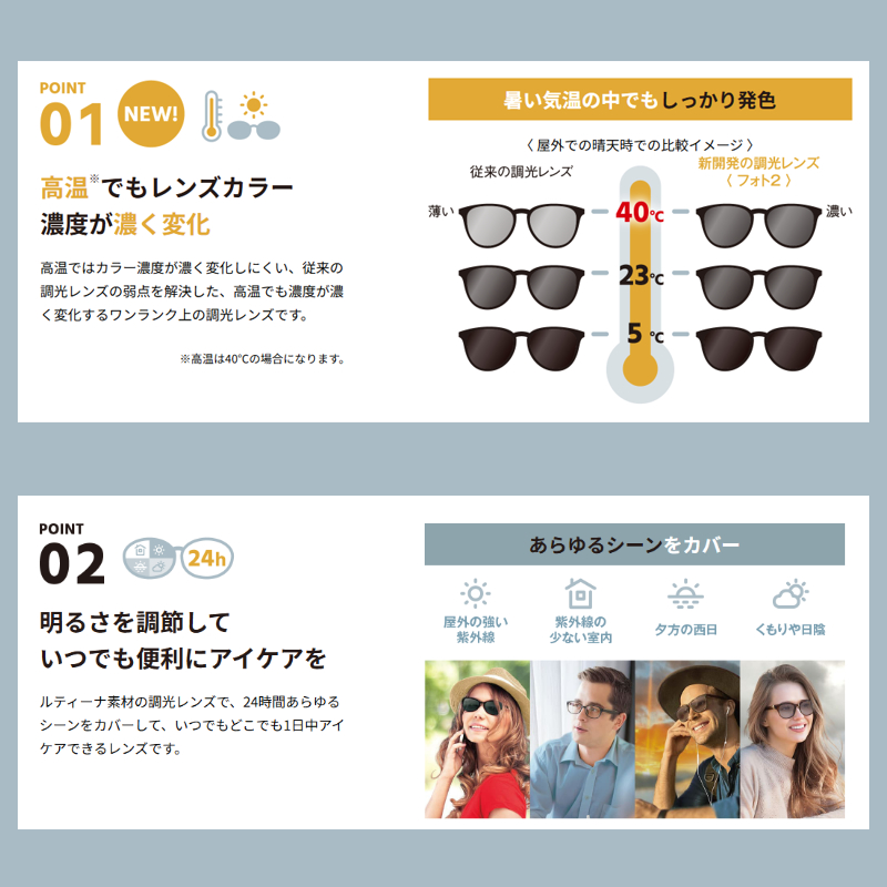 一般的な調光レンズは、気温が高いと色が濃くなりにくい傾向がありますが、ルティーナ フォト2はその弱点に配慮した“高温適応型”として展開されています。