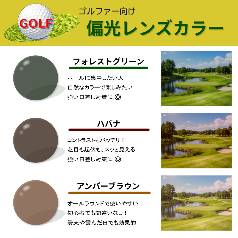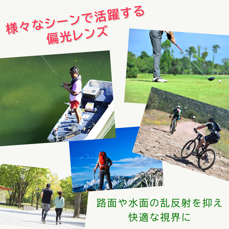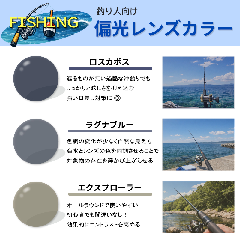 さらに、偏光レンズはカラーによって見た目の印象も大きく変わるため、機能だけでなく、仕上がりの雰囲気を楽しめるのも魅力です。