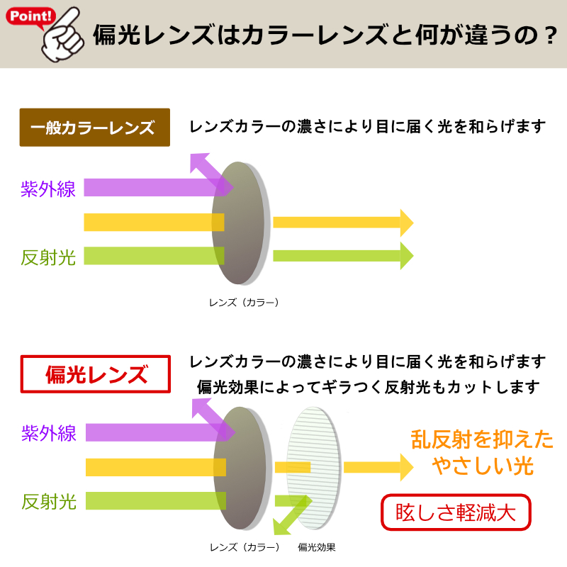 通常のサングラスではまぶしさを暗くして和らげるのに対し、偏光レンズは反射によるまぶしさそのものをカットしやすいのが大きな特長です。