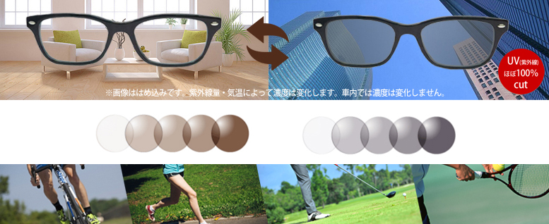 室内では無色。屋外ではサングラスのように色づく不思議なレンズ。メガネがサングラスに早変わり。紫外線(太陽光)に反応して変色します。