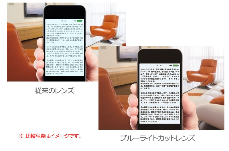 ブルーライトカットレンズは光の中の青色短波長の光をレンズ面で軽減し、眩しさやちらつきを抑える効果が期待されます。当店では高品位な国内メーカーレンズを使用。度なし・度付きに対応します。