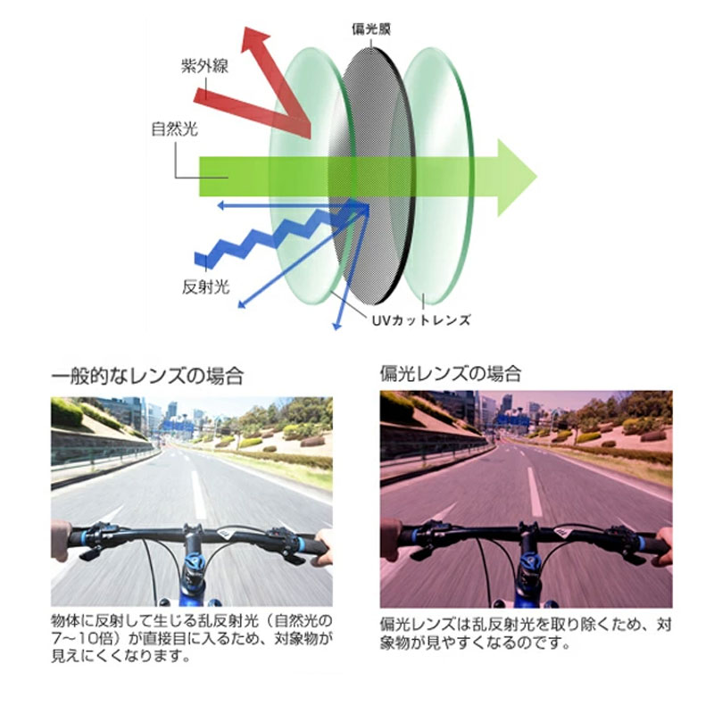 偏光レンズは特殊な膜により、水面や窓ガラス・路面の反射を抑え、見たいものを的確に見ることができるカラーレンズです。