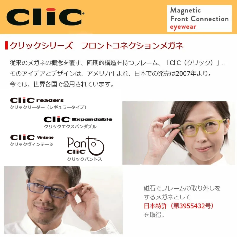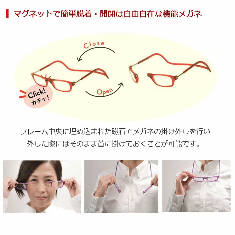 有名人がテレビで掛けて、すっかりおなじみとなったクリックリーダーシリーズ(CLIC READER) です。 フロント部分のマグネットを外すことで簡単に外すことができます。使用しないときにはそのまま首に掛けられるので、置き忘れたり紛失することはありません。