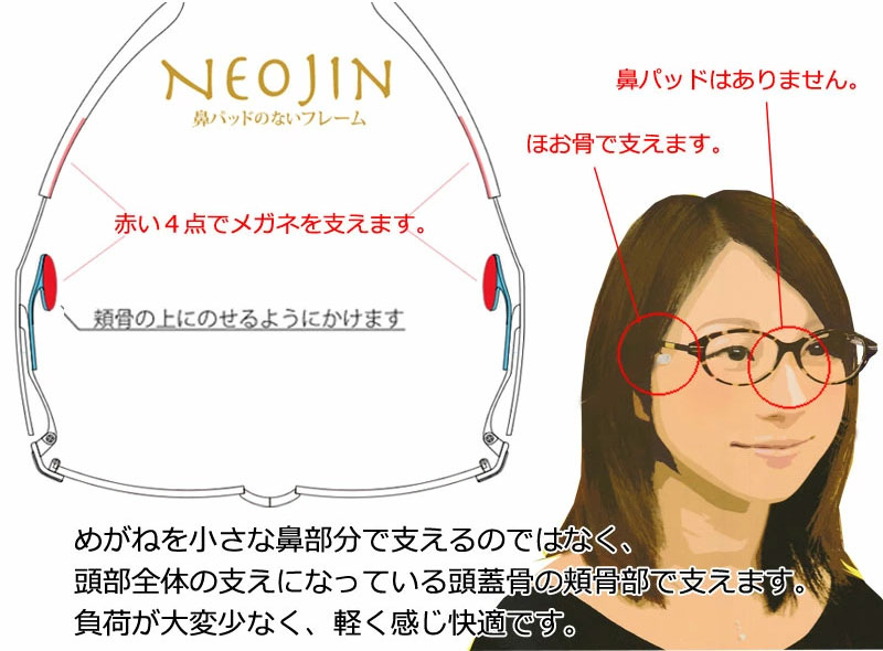 側頭部のモダンで頬を挟むことで、お鼻には触れることがなくかけられます。通常のメガネではお鼻に跡が残るといった心配から解消されます。